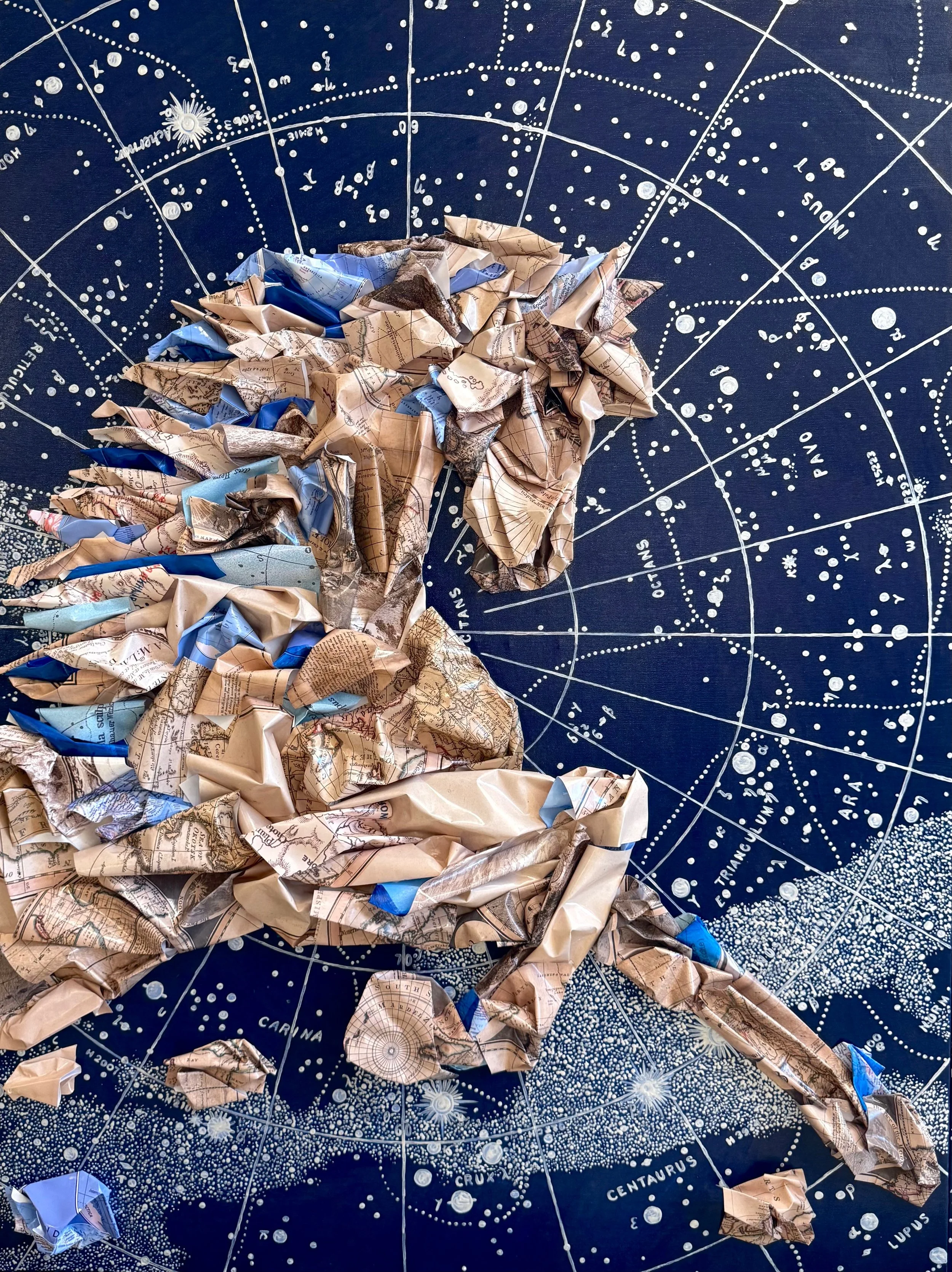 In recent years, she has incorporated antique star maps and textured elements into her practice. A portion of the proceeds from her art sales is dedicated to supporting children affected by the war in Ukraine.