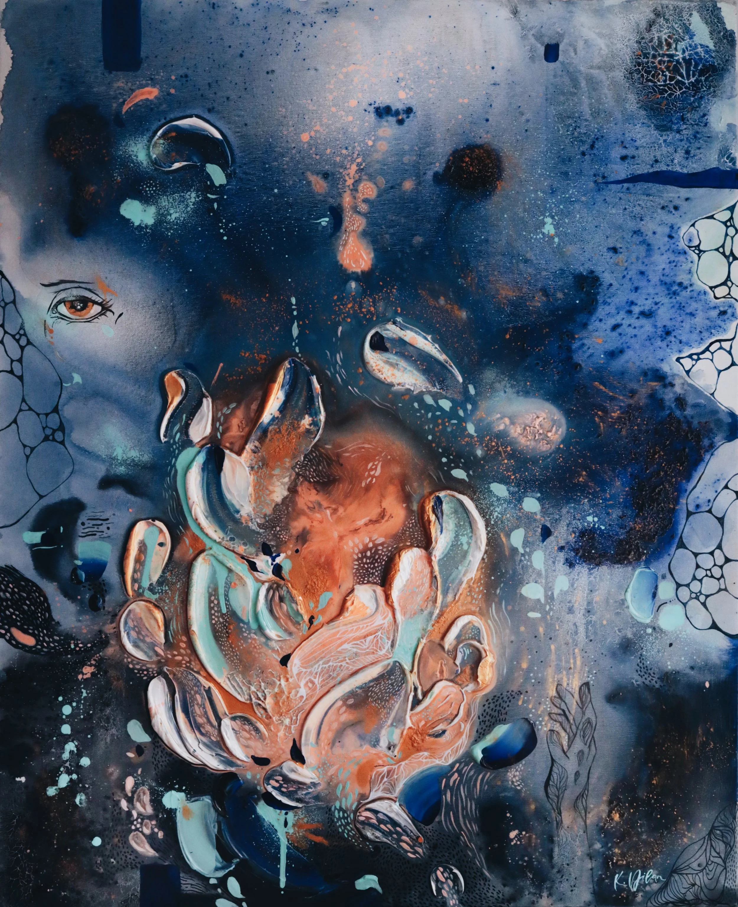Kell is a mixed-media abstract expressionist whose practice engages with the wild and sacred rhythms of nature. Her work traces the delicate threads that connect earth, spirit, faith, and emotion.