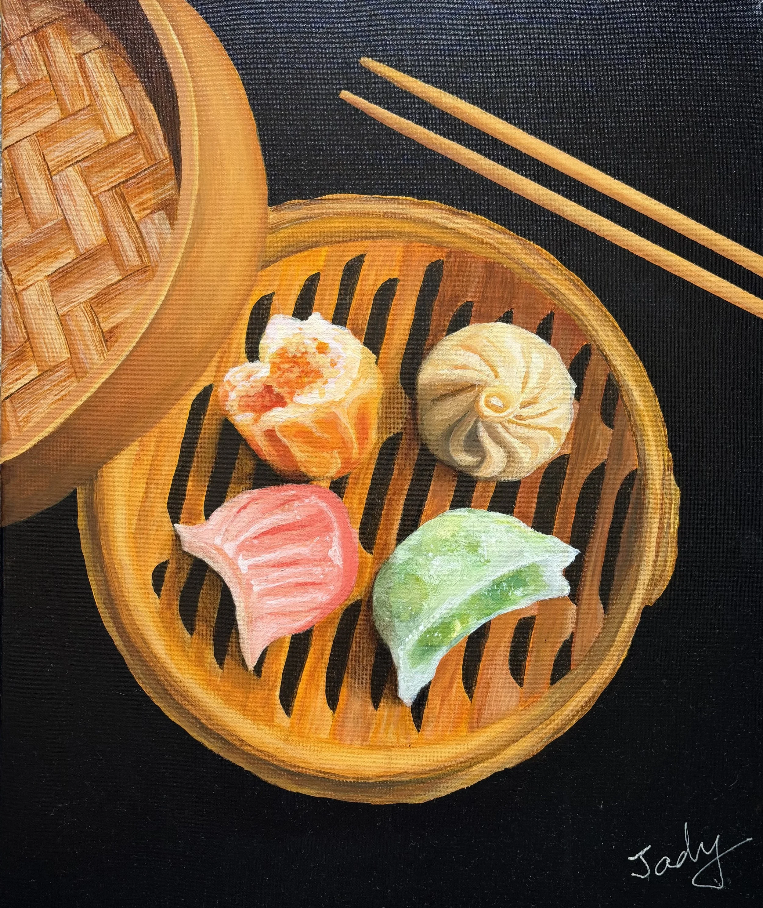 Shanghai-born, Hong Kong-based artist Jady Xu (she/her) turns our obsession with photographing food into something far more lasting—vivid acrylic paintings that blend realism with imagination. By day, she navigates the fast-paced world of IT; by night, she brings dishes to life with brushstrokes that glisten, crunch, and glow. Specializing in acrylic food art, Jady captures more than just meals—she paints memories, moods, and cultural layers. With bold colors, unexpected textures, and storytelling rooted in her dual heritage, her work invites us to pause, look closer, and taste with our eyes. For Jady, art isn’t just imitation—it’s emotion, curiosity, and a celebration of what feeds both body and soul.