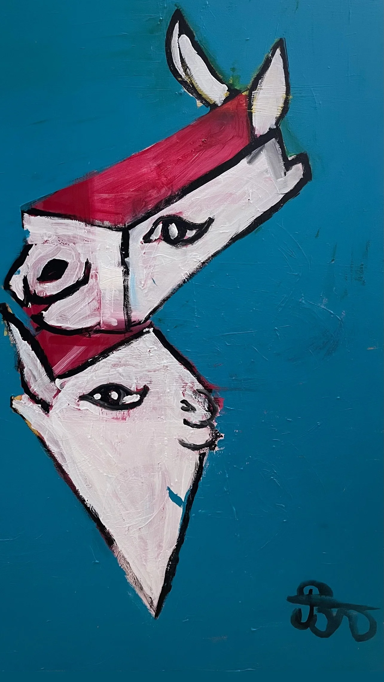 In this work, the dual-headed figure evokes a sense of internal duality, two identities bound within a single structure. The stylized animal form, reduced to essential lines and planes, becomes a vessel for psychological reflection. The bold contrast between the vivid red and the calm blue background heightens this tension, suggesting both conflict and coexistence.